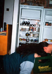 Jízda přeplněným výtahem do Chaloupky. |
