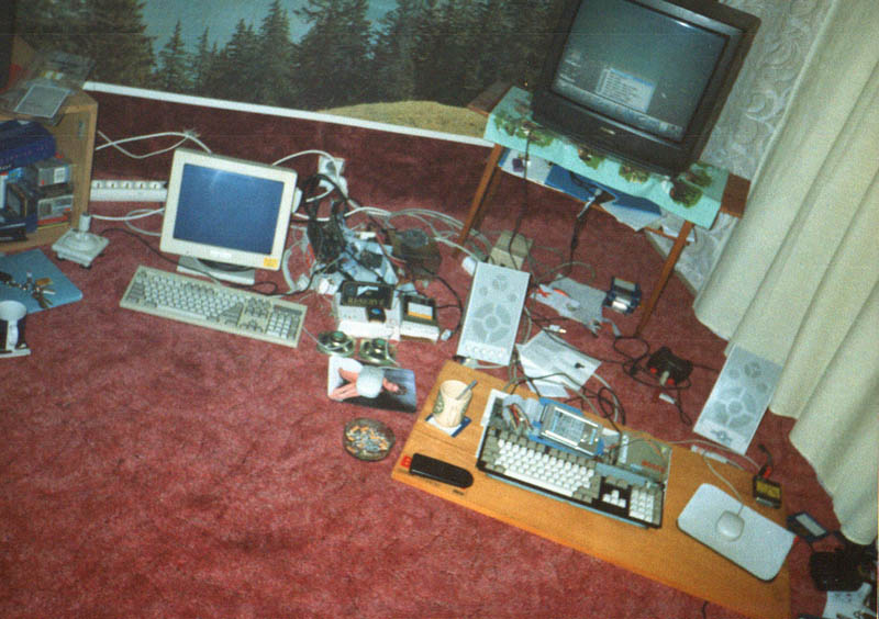 Výpočetní středisko, po zemi rozházené PC a Amiga. |