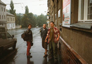 Cesta na nádraží, všude samý déšť, Holy v popředí, vzadu Wolf a Redaktor