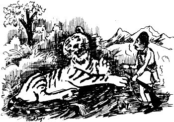 Jednoho dne šel muž do lesa, aby tam lovil ptáky a potkal tygra. Tygr se chtěl na něj už už vrhnout, když mu muž nabídl, aby si raději navzájem nedělali potíže a spřátelili se. Tygrovi se myšlenka líbila a řekl: