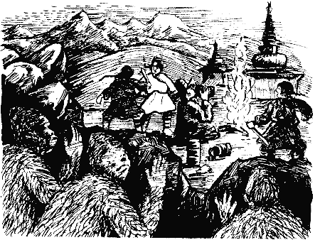 Jednoho dne vesničané vymysleli plán, jak yettiům zabránit v dalším drancování. Vydali se na místo, odkud je mohli sněžní lidé dobře pozorovat a vzali s sebou nádoby plné čangu a dřevěné napodobeniny mečů. Vypili čang a pak, už značně opilí, spolu pomocí mečů urputně zápolili. Nakonec, provázeni upřenými pohledy yettiů, odešli domů. Meče a nádoby nechali na místě.