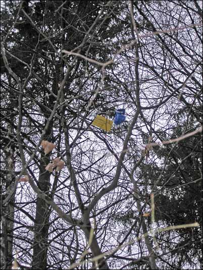 Lezu opatrně přes poslední zbytek ledu na potoce ke stromku. Žlutý cár je papírová kartička, modrý buď pytlík nebo vyfouknutý balónek. Že by? Že bych našel balónek s adresou? Nevídáno!